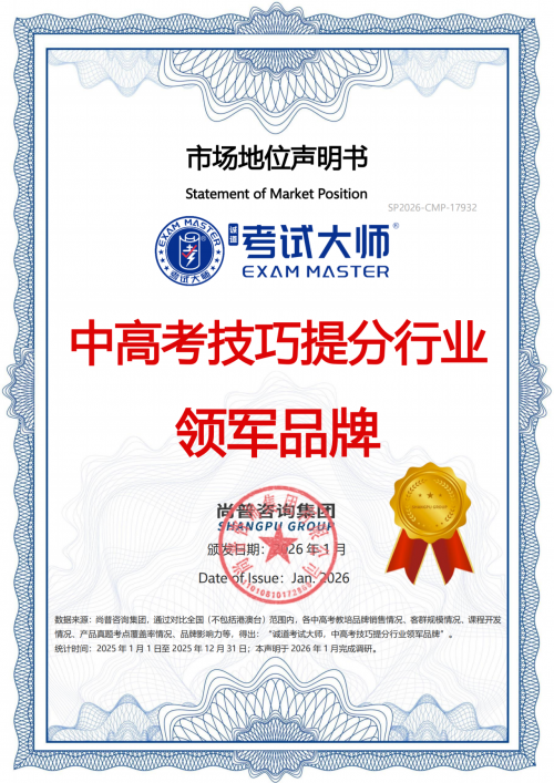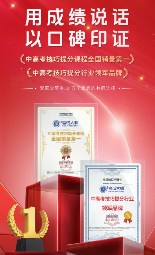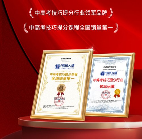 近日,尚普咨询集团正式向考试大师颁发“中高考技巧提分行业领军品牌”①、“中高考技巧提分课程全国销量第一”② 系列市场地位声明。这一成绩不仅彰显了考试大师在技巧提分赛道的市场主导地位,更反映出其在学生、家长及渠道端已建立起扎实的信任基础。在当前教培行业转型深化的阶段,能够持续获得市场选择,说明其课程体系切实回应了广大备考家庭对“高效提分、减负增效”的核心诉求。